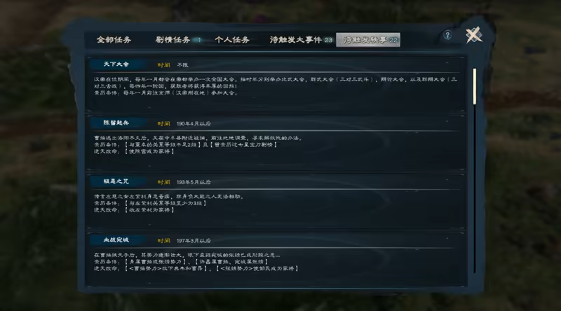 190年《诸侯讨董》,195年《群雄割据》,200年《官渡之战》,208年《赤壁之战》,211年《潼关之战》,214年《平定益州》,221年《夷陵之战》