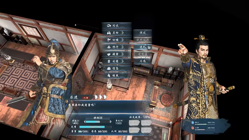 • 社交兴趣与话题:每个季度与武将执行的社交次数一般受到对方对玩家的社交兴趣所限制,关系等级越高,每个季度提高的社交兴趣值越多。通过送对方喜欢的礼物提高社交兴趣,是快速提高关系的好方法。此外,游戏中可以获得各种话题,将这些话题与其他武将分享时,可以提高心情,增进双方关系,并获得一些六维经验。