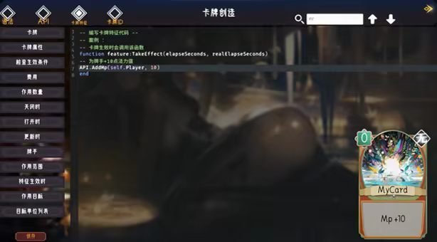 支持直接在游戏中创建模组制作卡牌,全程支持可视化交互,无需逆向游戏,也不需要安装几十G的编辑器和IDE。游戏中内置了文本编辑器,只需两张图片几行Lua代码即可。游戏中还提供了丰富的功能面板,语法、接口、常用功能等帮助玩家快速创作。