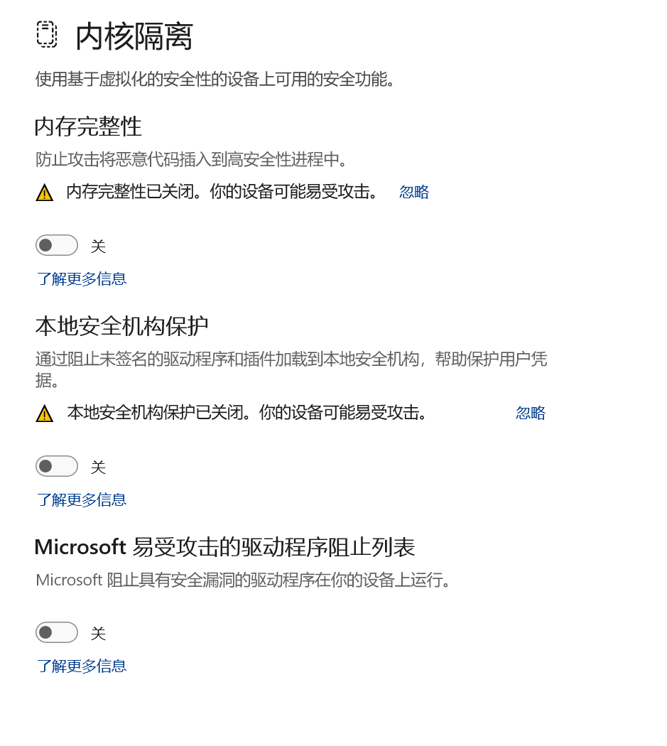 - 关闭内核隔离:设置 -> 隐私和安全 -> Windows 安全中心 -> 设备安全性 -> 内核隔离 -> 内存完整性 (关)。